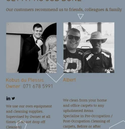 Carpet Cleaning - any size, from wall-to-wall or loose carpets Upholstery Cleaning Home Cleaning - entire home or areas you require Office Cleaning - from one office to full office blocks On-site Carwash On-site Car valet On-site Industrial vehicle cleaning Read more