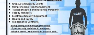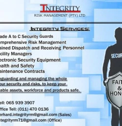 We at Integrity Risk Management are excited to assist your company/organization with security and risk management solutions, we are committed to you already and want to provide the best possible solutions. As our company motto says Faith and Honor we want to guarantee that our commitment to you will be faithful and honorable. We are a VAT registered Risk Management and Security Provider registered with the Private Security Industry Regulating Authority (P.S.i.R.A) and a BEE contributor. Our guards... Read more